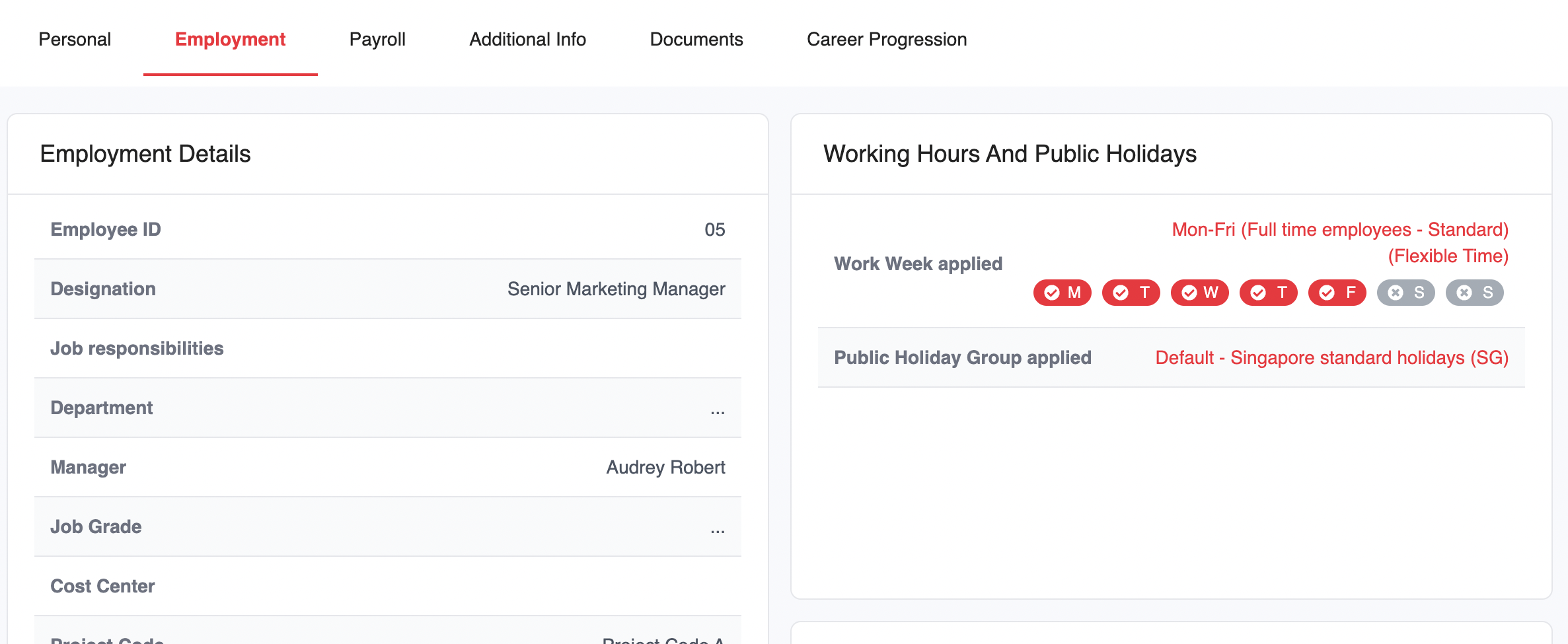 This tab displays your employment information, including your job title, department, and working hours.