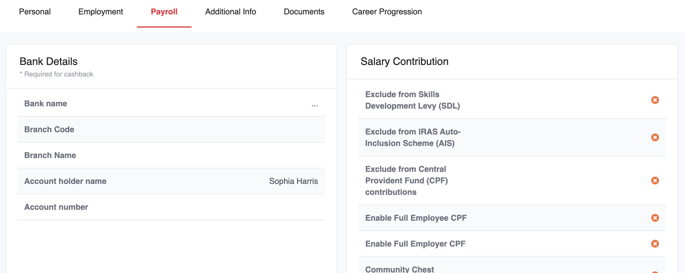 This tab displays your payroll-related information, such as salary and payment details.