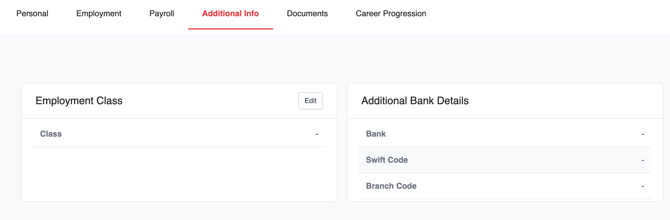 This tab contains any additional information configured by your company. Fields in this section are editable only if editing has been enabled for that specific section.