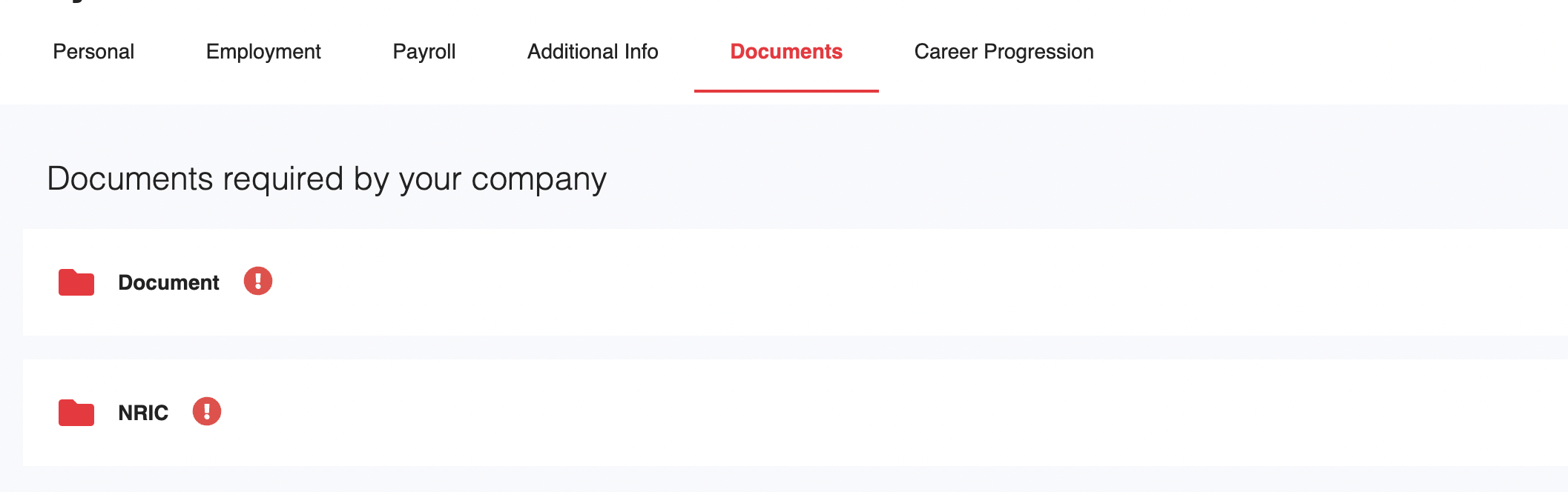 You can upload any required documents set by your company under this tab. Folders with missing documents or pending approval will be indicated with a '!' symbol.