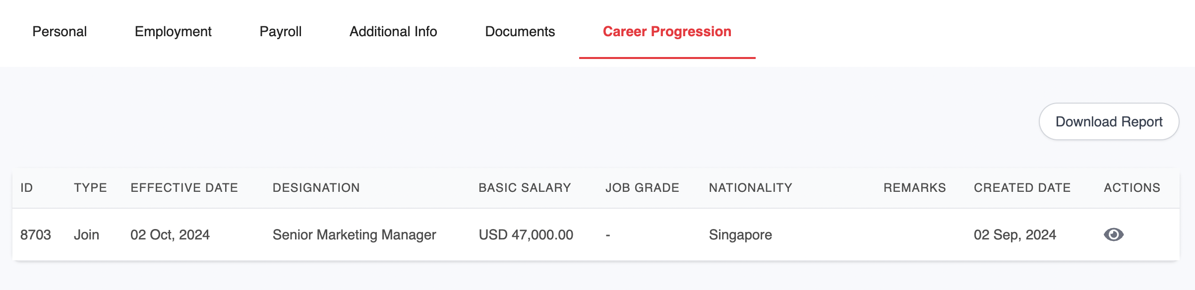 This tab provides a record of your employment history and progression within the company.