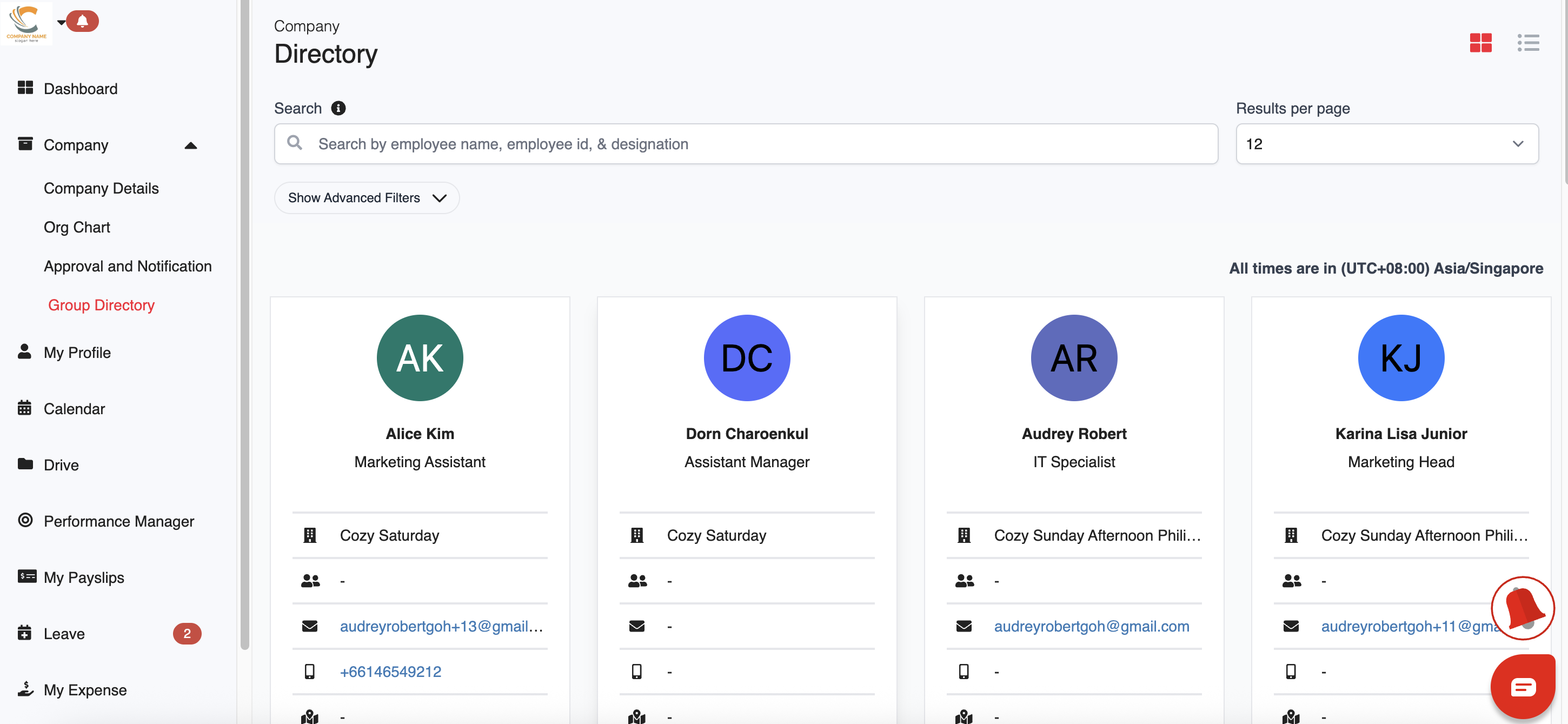 Here, you can view key details for each employee such as their department, email address and phone number.