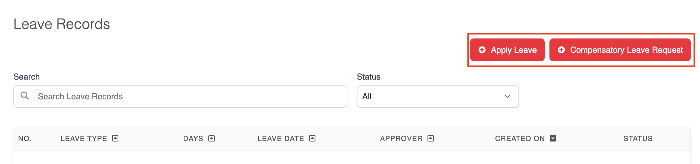 Scroll down to the Leave Records section and click on the Apply Leave or Compensatory Leave Request button and fill in the required details. (See this article to learn more: How to apply for leave)