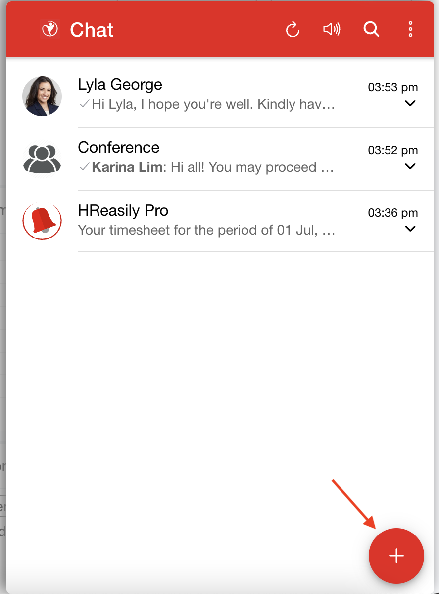 Click on the "+" icon at the bottom right of the page or the 3 dots at the top right > New Group to create a new chat group.