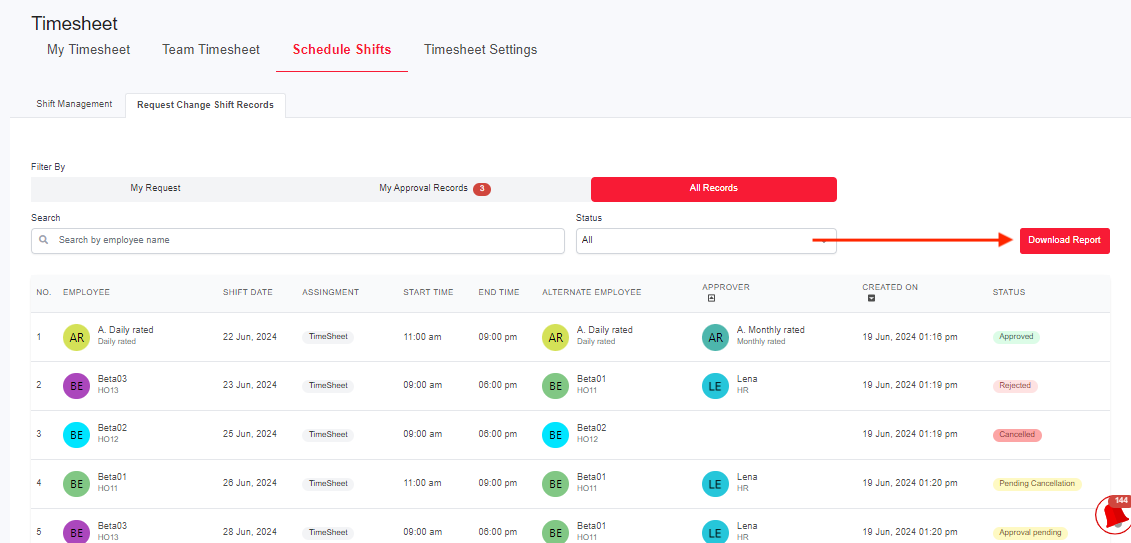 Navigate to the Request Change Shift Records tab and click on the "Download Report" button. This report enables you to view the scheduled shift records.