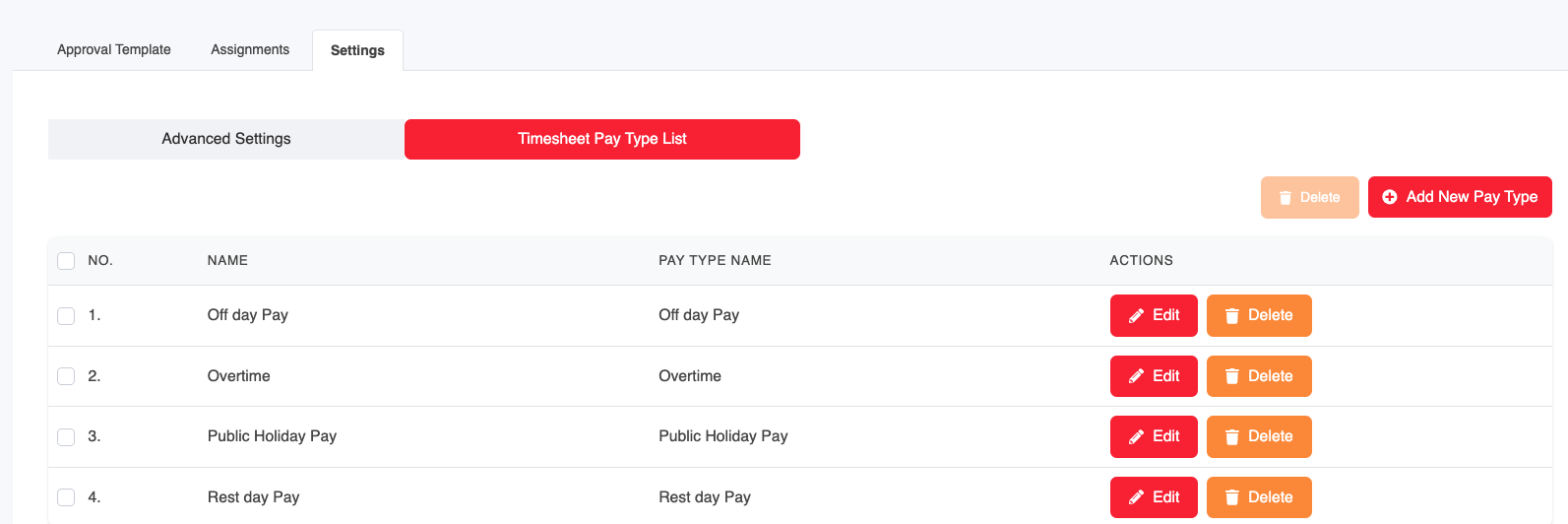 Here, you’ll see a list of default timesheet pay types such as overtime, and Off day Pay.