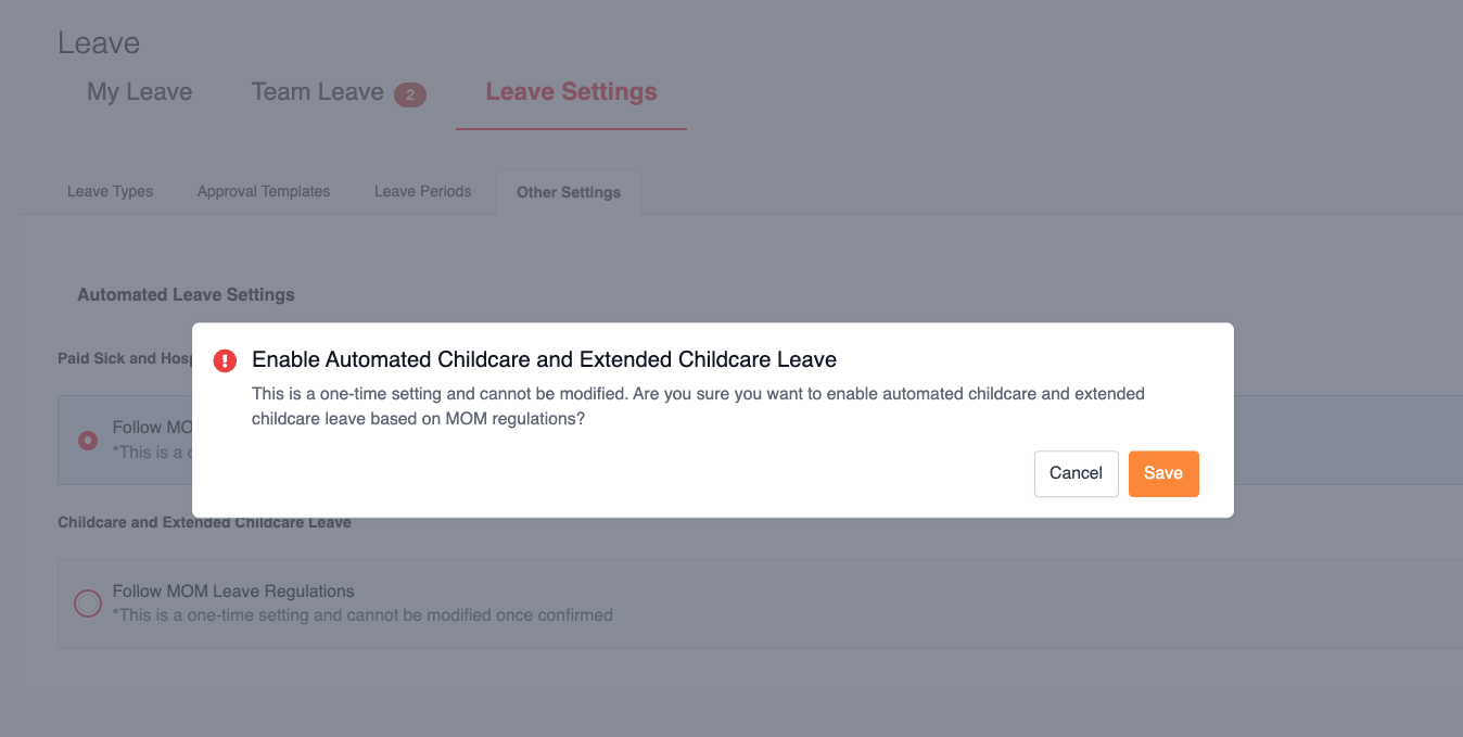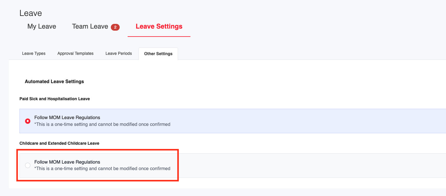 2. Under Childcare and Extended Childcare Leave, select Follow MOM Leave Regulations.