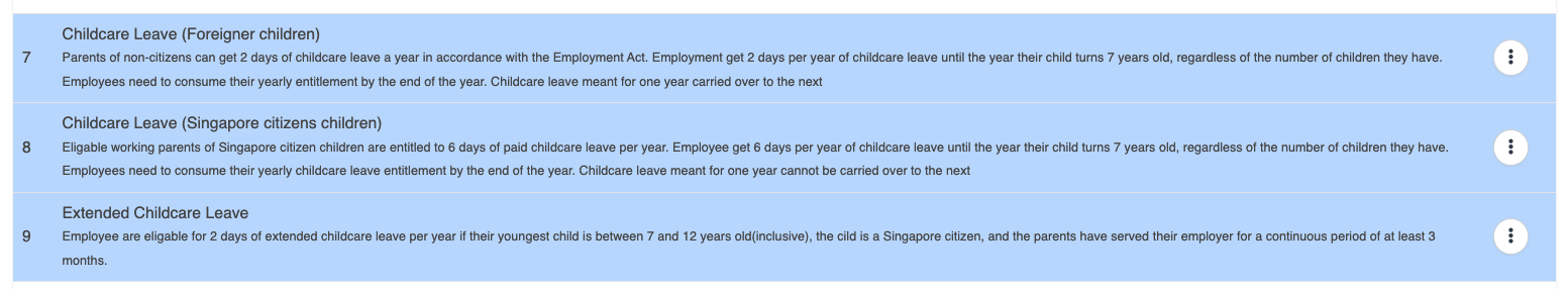 Employee’s youngest child is aged 7-12 years with Singaporean nationality, and the employee has worked for at least 3 months. | 2 days of extended childcare leave will be assigned. |