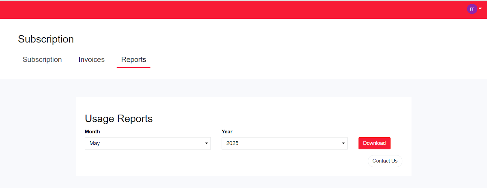 To download the usage report for the month, click the dropdown menu at the top right corner of your screen and select Manage Subscription.