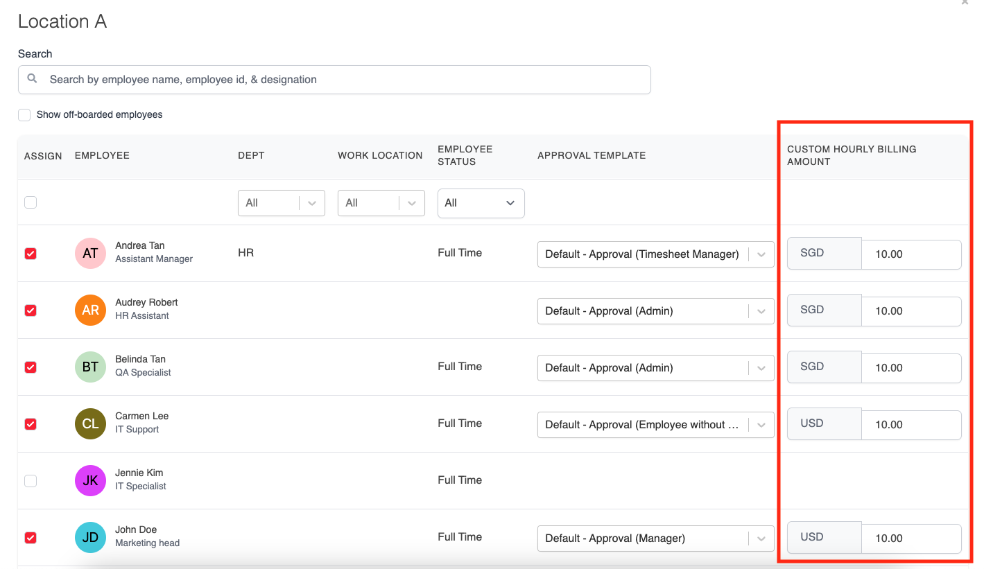 When assigning assignments in bulk, billing amounts can be customized for each employee depending on the selected Pay Item's Variable Type (e.g., fixed amount, rate, or percentage).