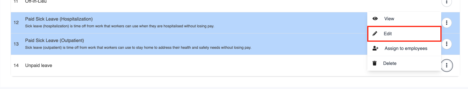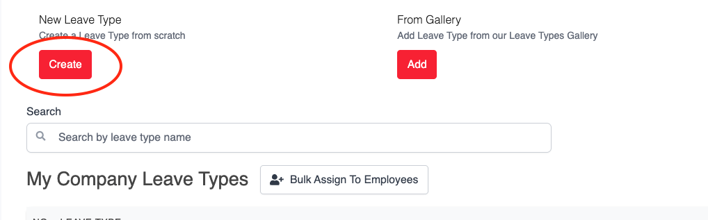 2. Click on the Create button to set up a new custom leave type, or select an existing leave type to modify its settings.