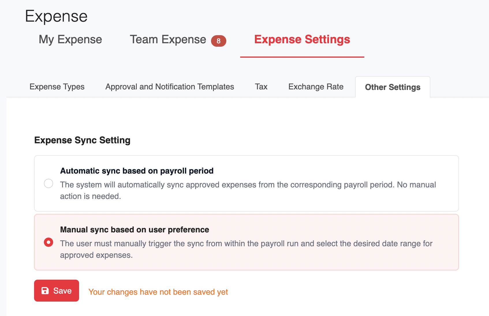 Approved expense claims can now be synced to payroll either automatically or manually, based on your company's workflow preferences. The following steps outline how the settings can be configured: