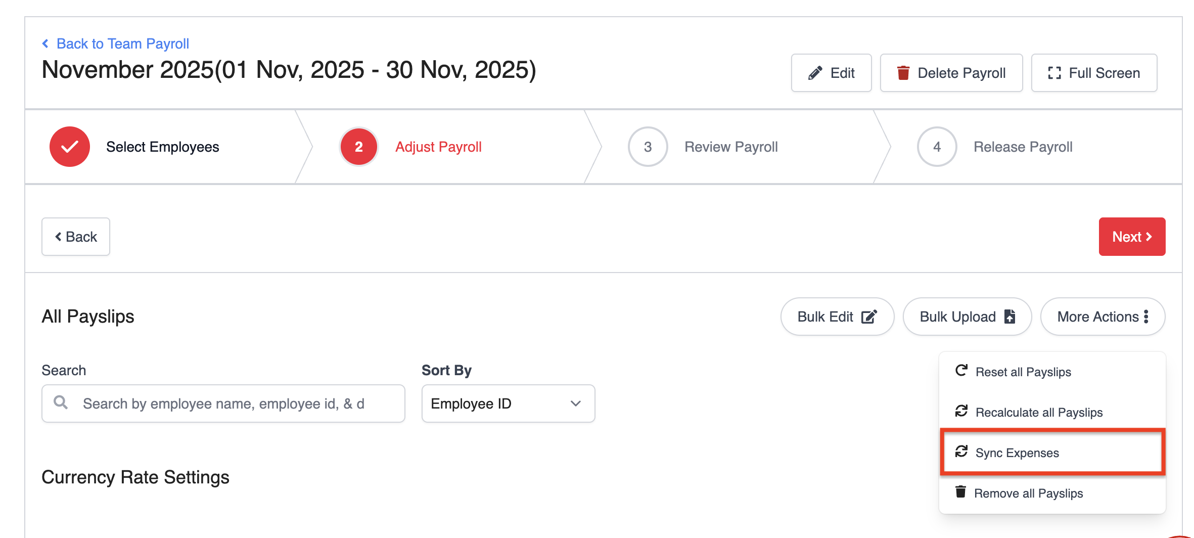 If Manual Sync is selected, a Sync Expenses button will appear in the payroll module once a payroll run has been created.
