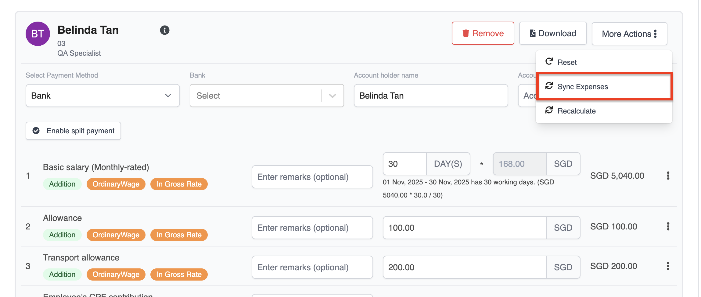 2. Click More Actions next to the payslip and select Sync Expenses.