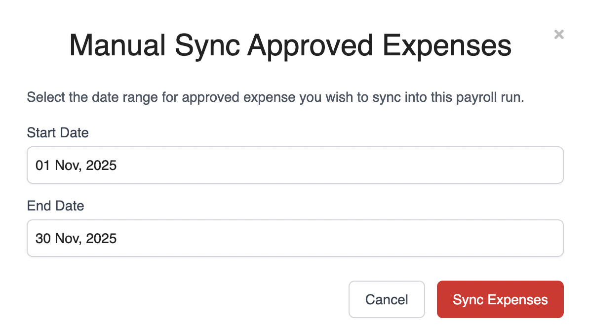 3. Choose the date range for the approved expenses you want to include in the payroll, then click Sync Expenses.