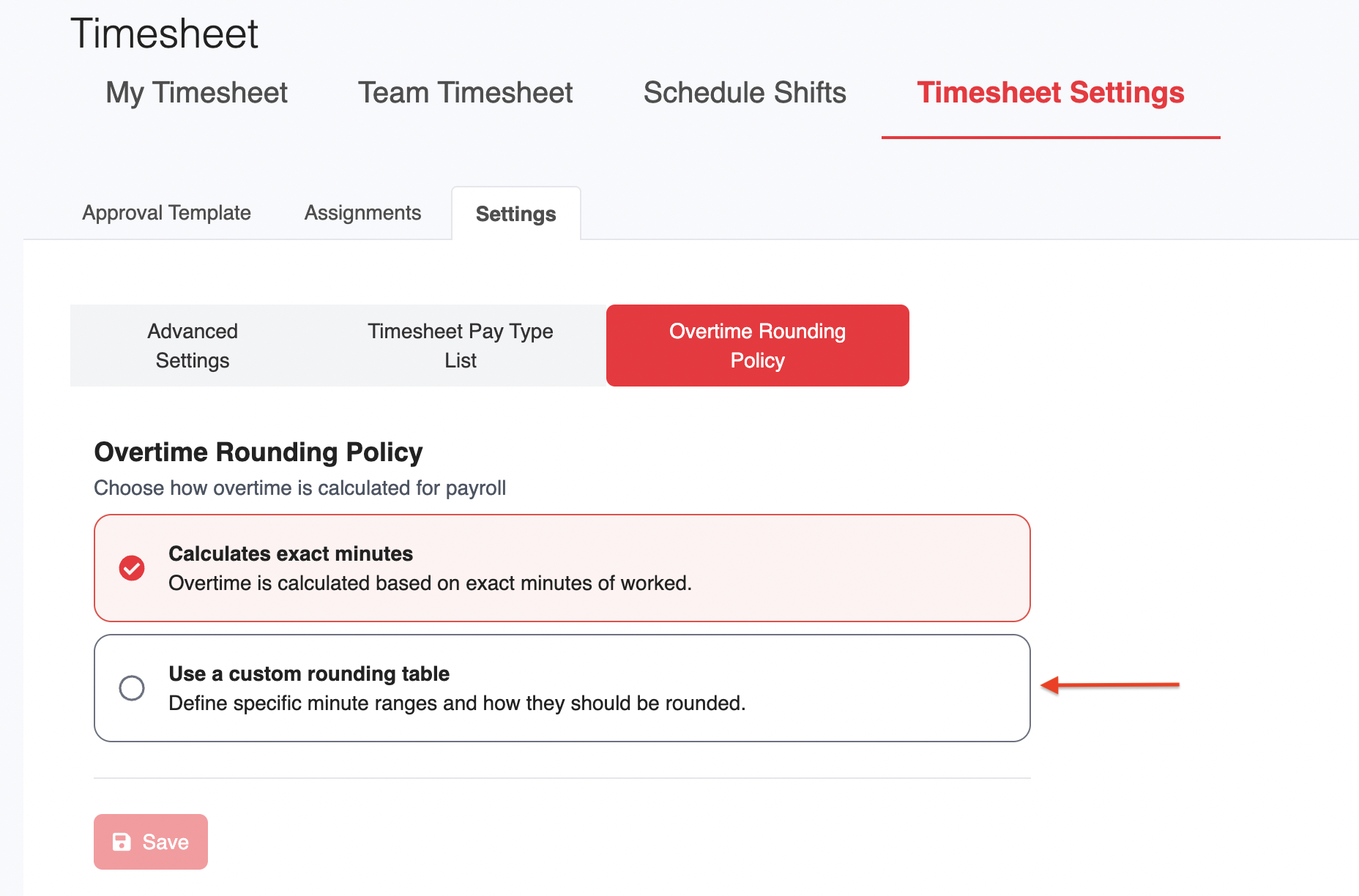1. Go to Timesheet > Timesheet Settings > Settings > Overtime Rounding Policy.
