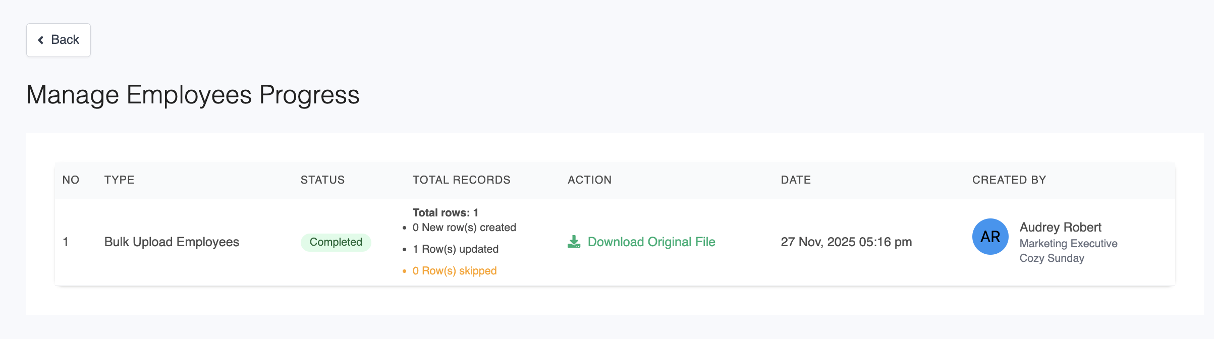 7. You will be redirected to the Manage Employees Progress page. Here, you can view the import status, total records processed, download the original file and check the date of the upload.