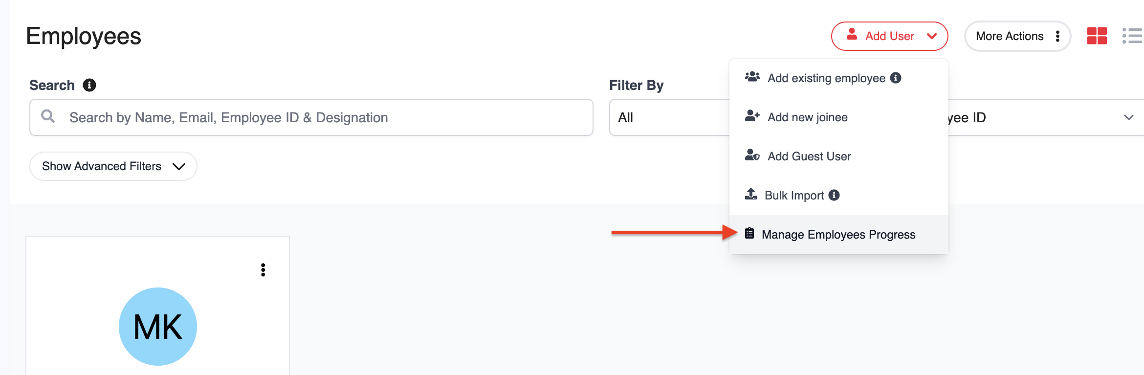 8. To access the Manage Employees Progress page anytime, go to My Employees > Add User > Manage Employees Progress.