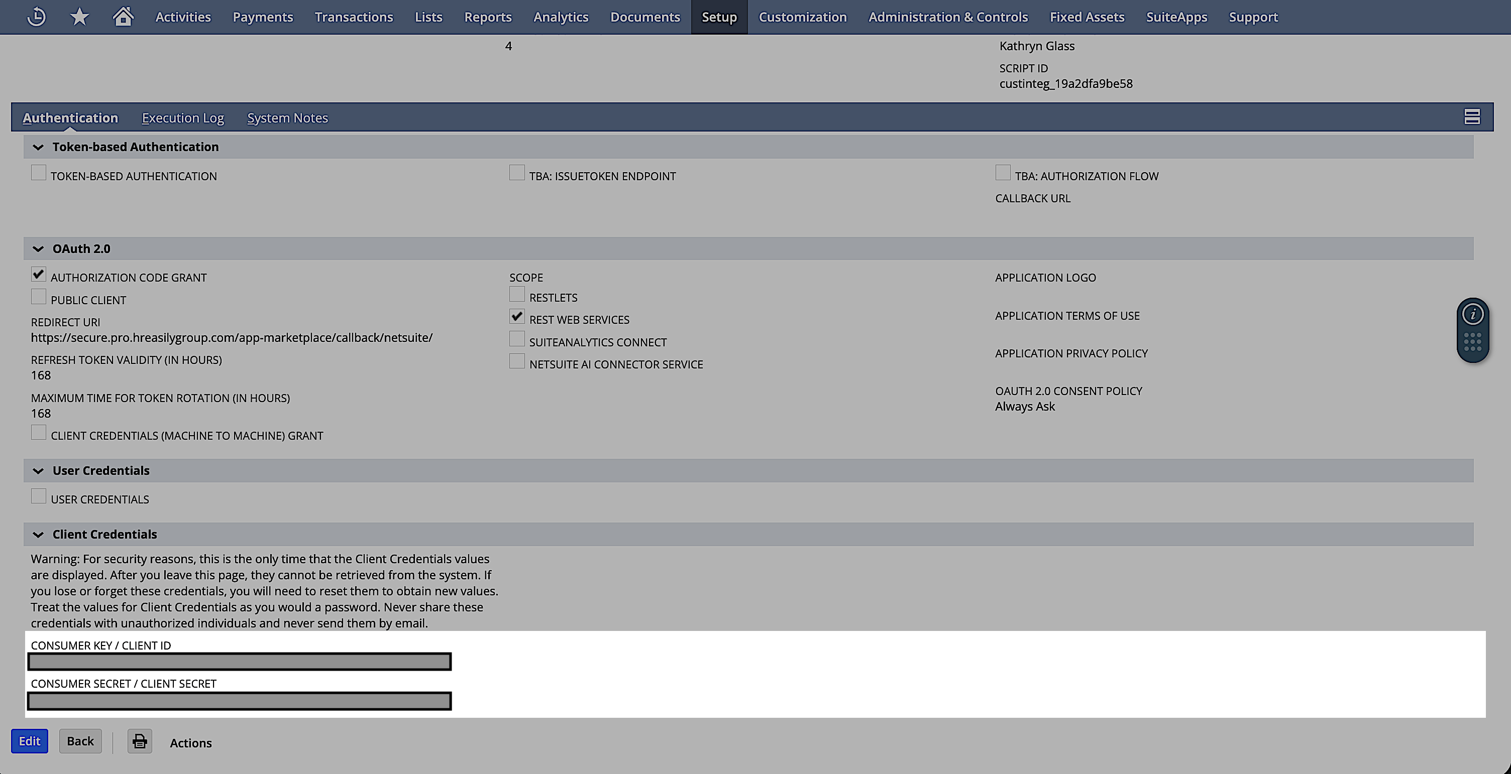 3. Click Save. NetSuite will now generate your Client ID and Client Secret.