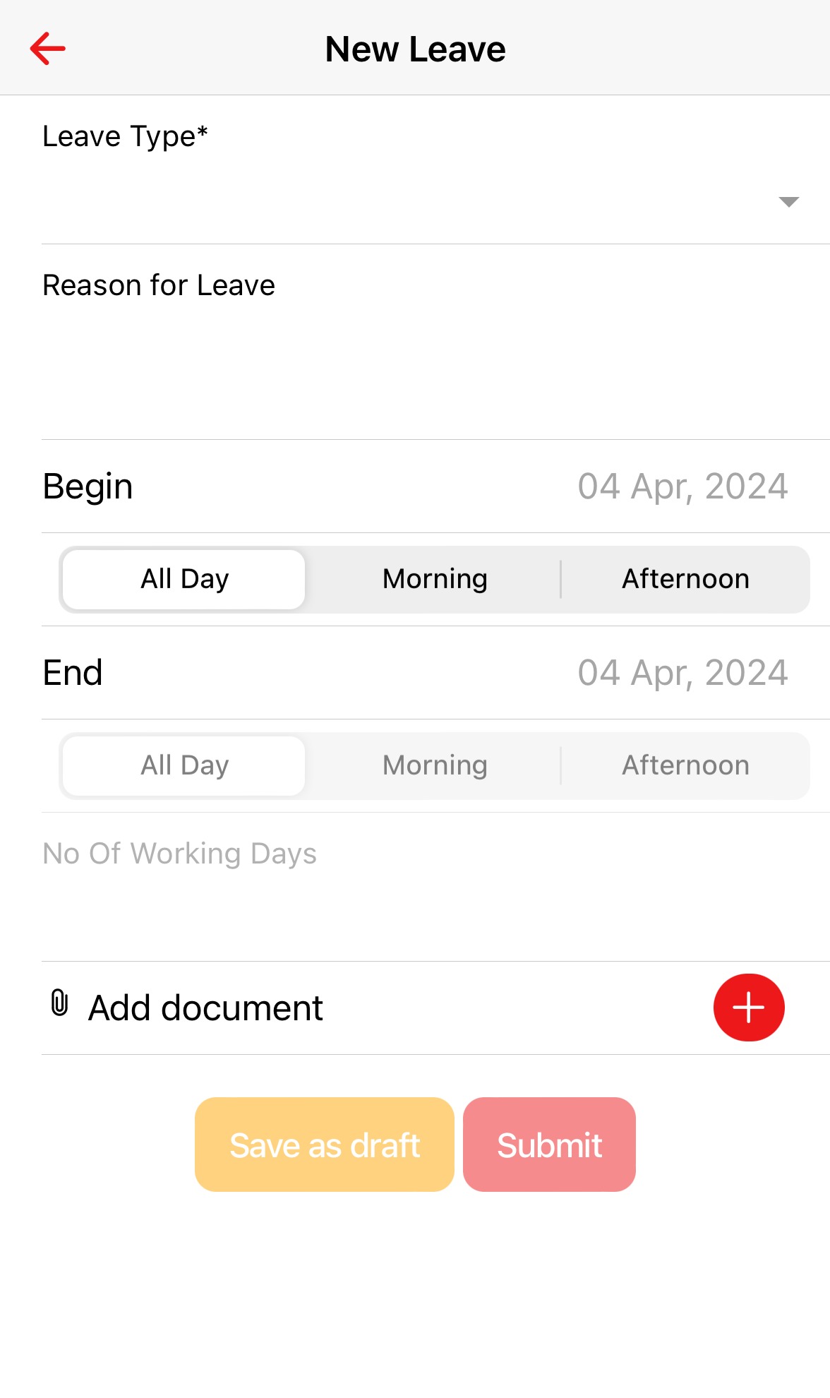 End – The date when the leave will end. There is an option next to this field to select All Day; or Morning/Afternoon for half day leave requests