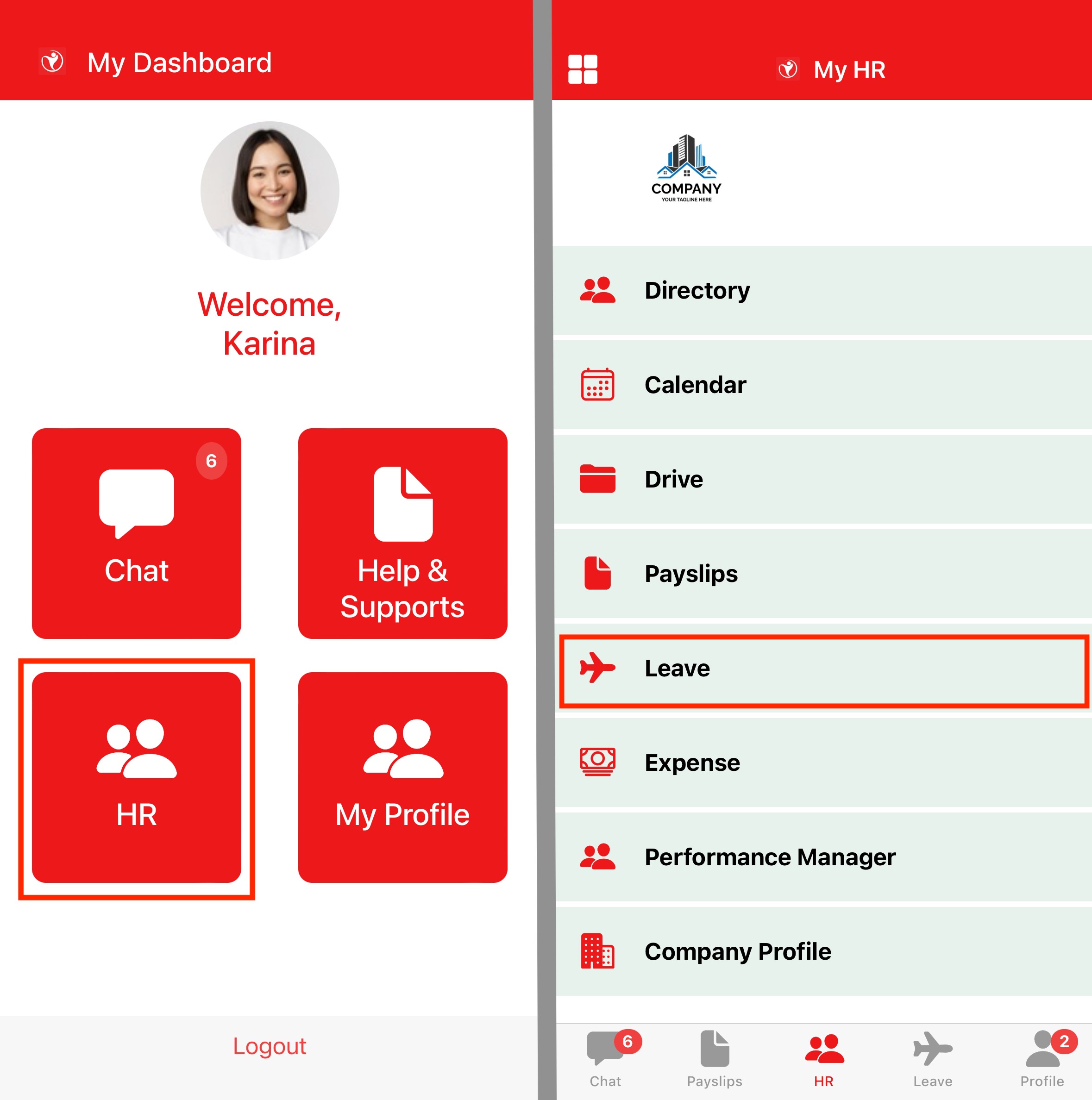 To apply for leave from the mobile app, Click on HR > Leave.