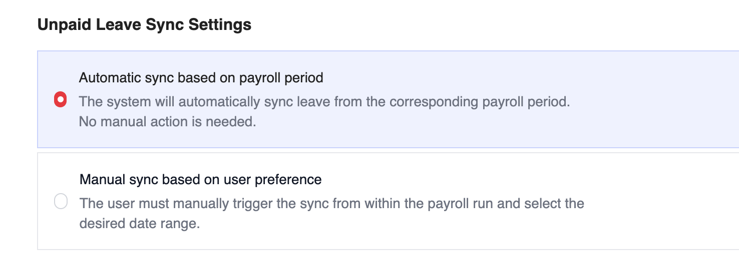 2. Under Unpaid Leave Sync Setting, choose one of the following options: