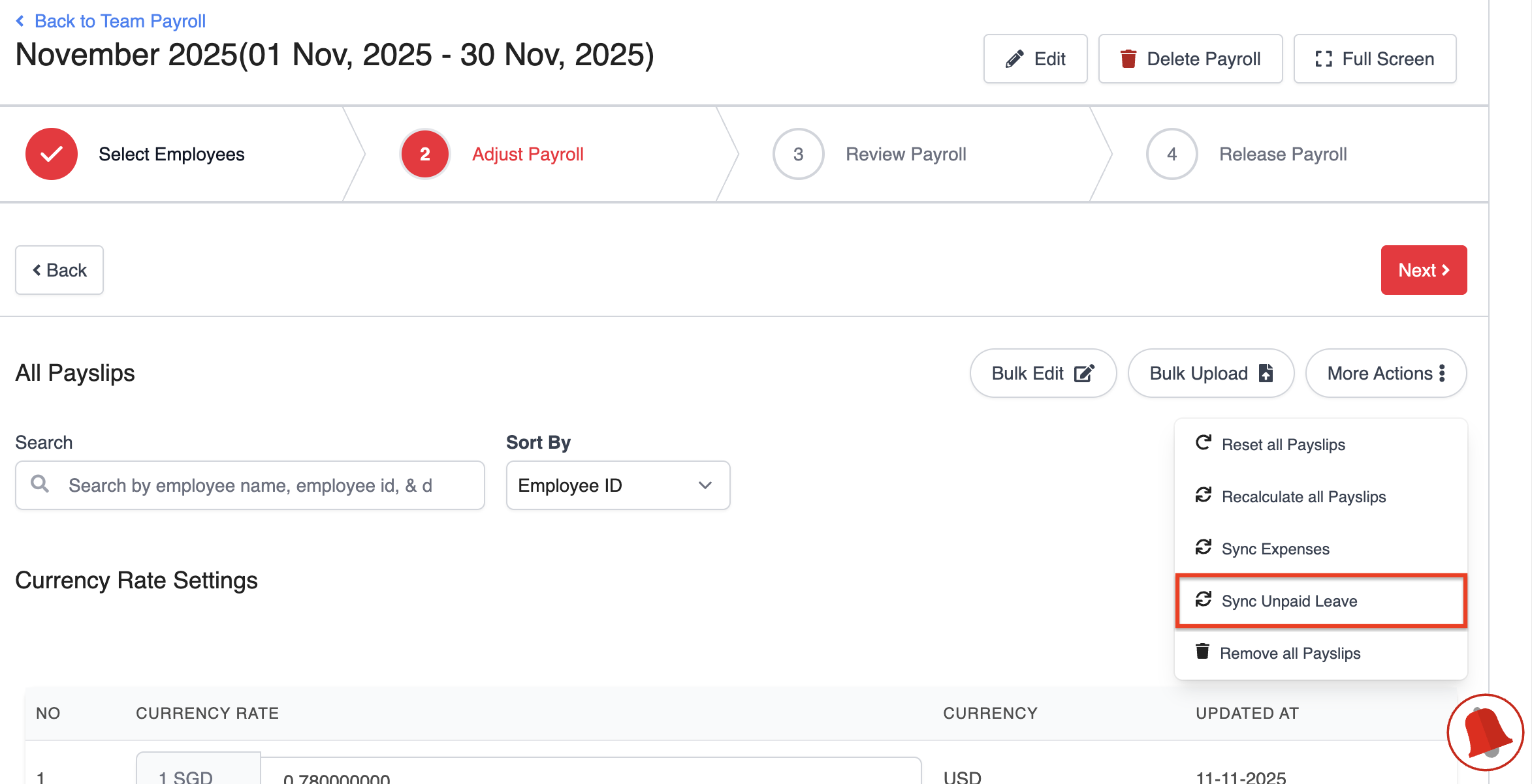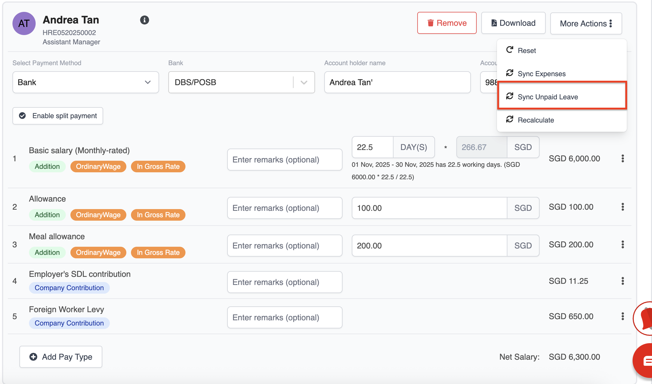 2. Click More Actions next to the payslip and select Sync Unpaid Leave.