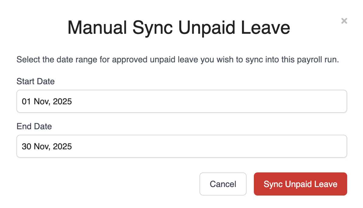 3. Choose the date range for the unpaid leave you want to include in the payroll, then click Sync Unpaid Leave.