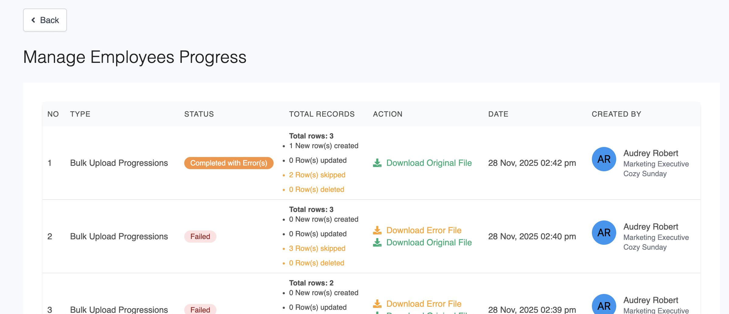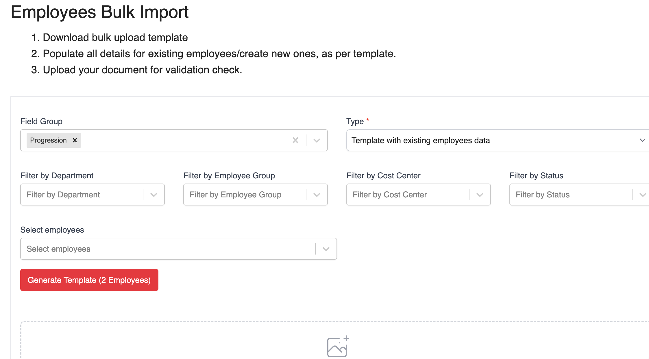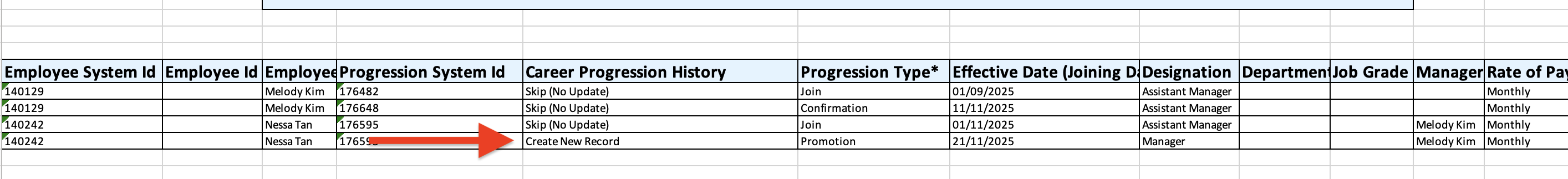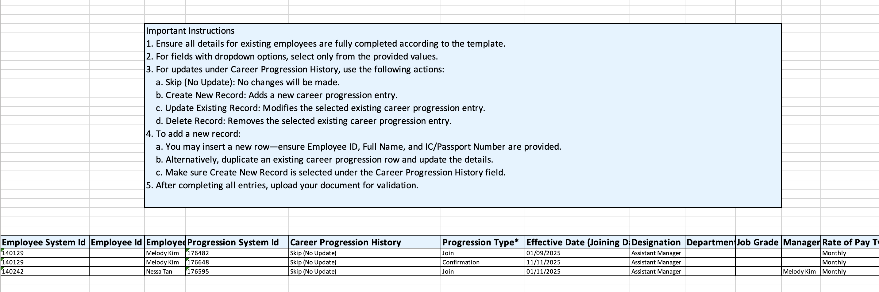 Bulk updating allows you to manage multiple employees' career progression records in one go. Follow the steps below to generate, edit, and upload the template.