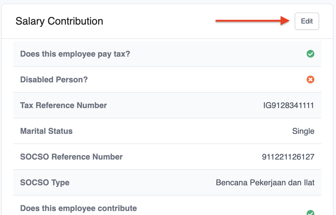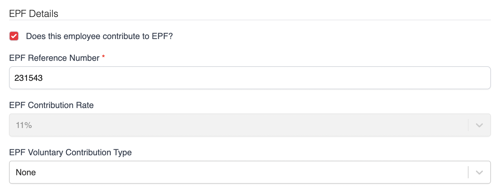 3. In the pop-up window, scroll to EPF Details, tick Does this employee contribute to EPF, and enter the EPF Reference Number. The system will automatically calculate the EPF rate based on the employee's age.