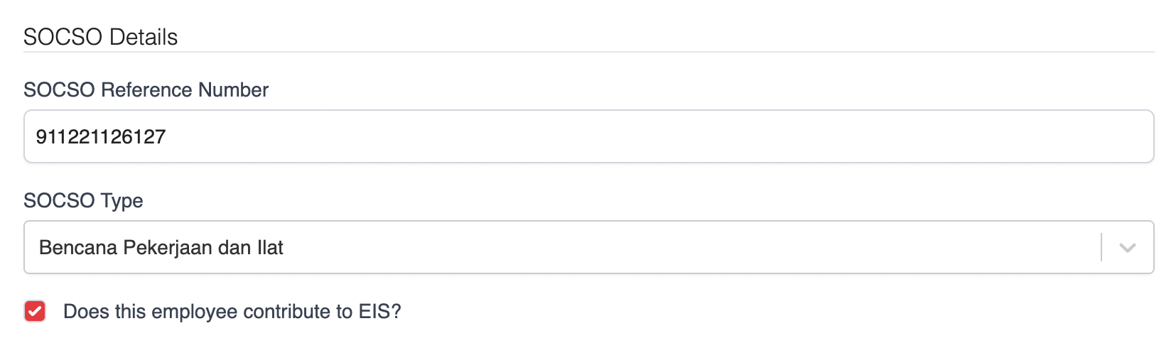 3. Scroll to SOCSO Details, enter the employee's SOCSO Reference Number, select the SOCSO Type, and tick Does this employee contribute to EIS.