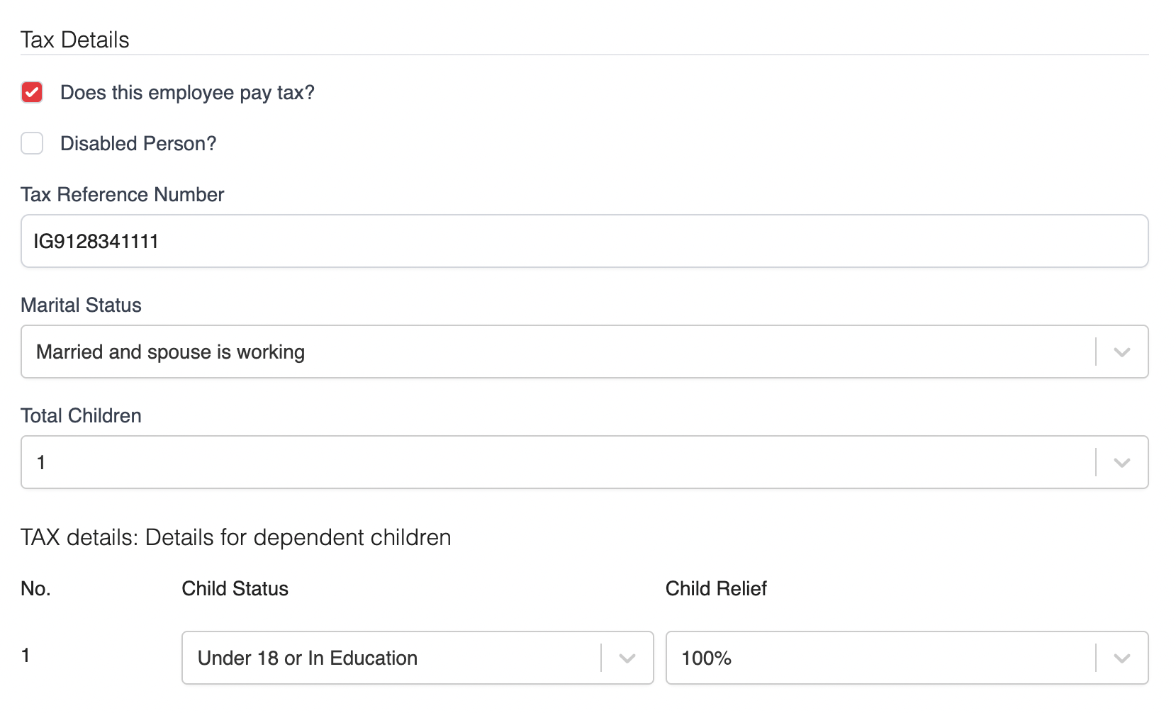 3. Enable Does this employee pay tax and fill in the required tax information, including tax reference number, marital status, and number of eligible children.