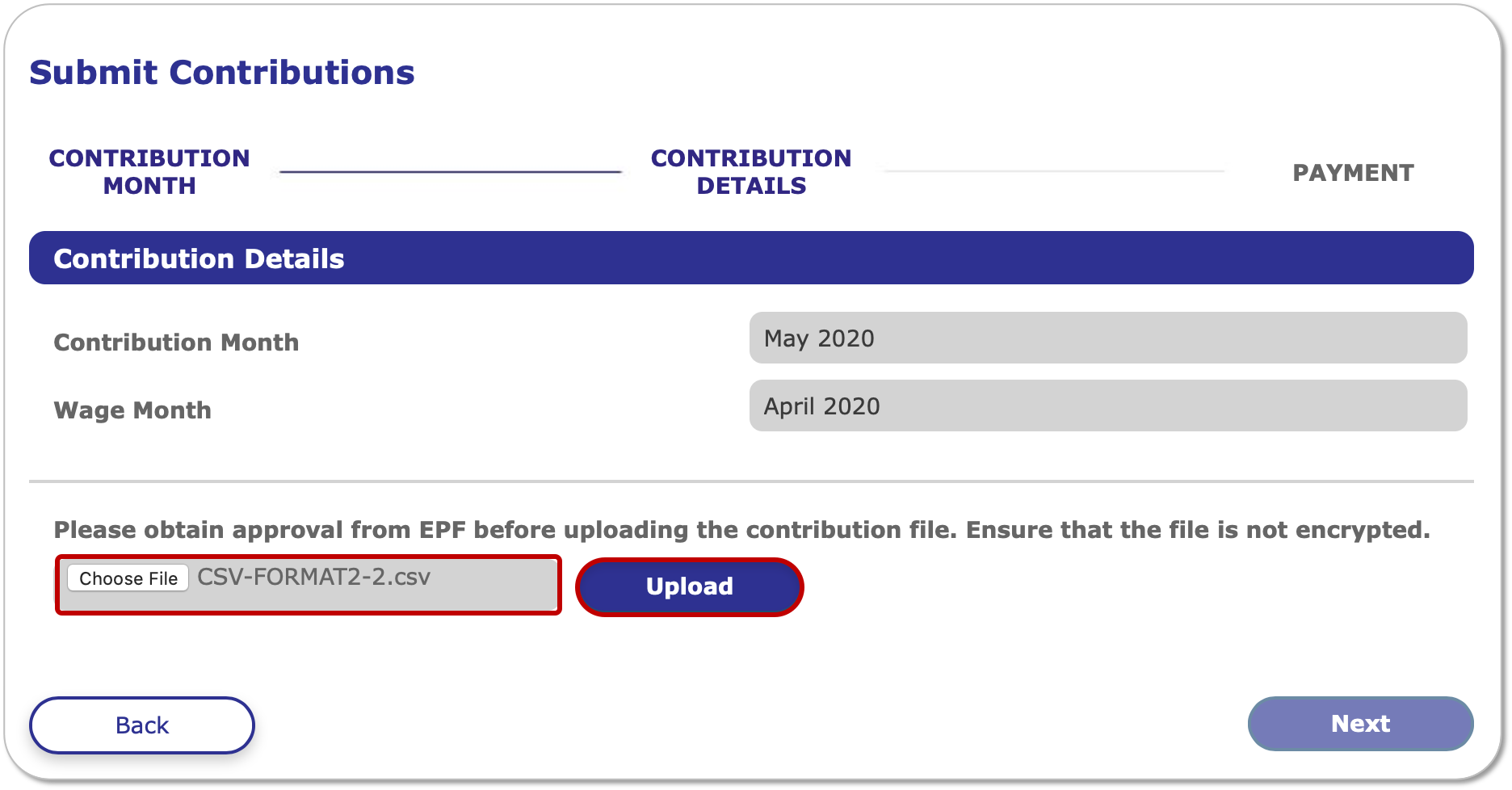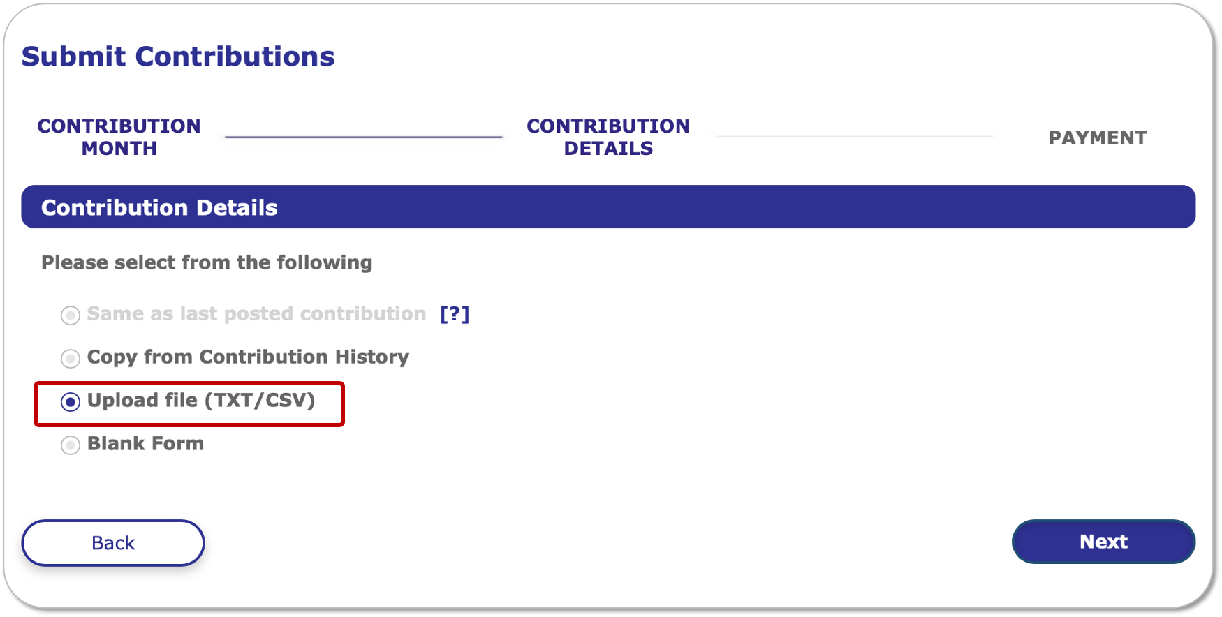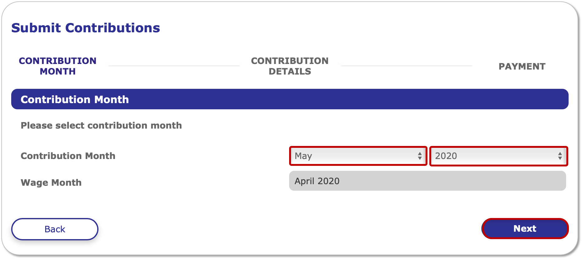 4. Confirm the correct Contribution Month before clicking Next.