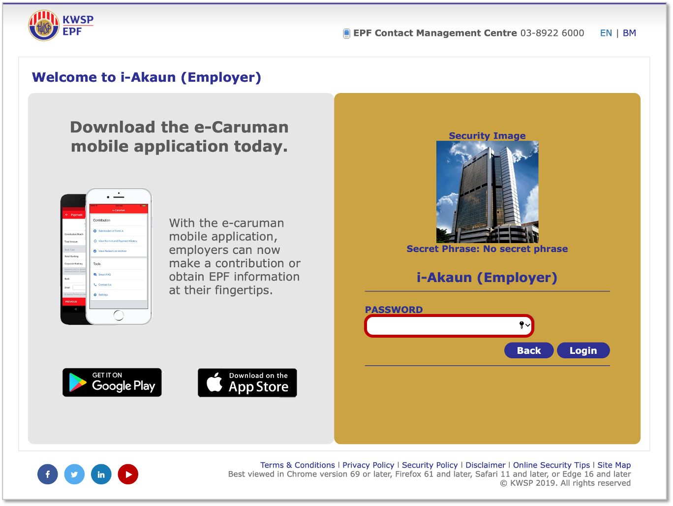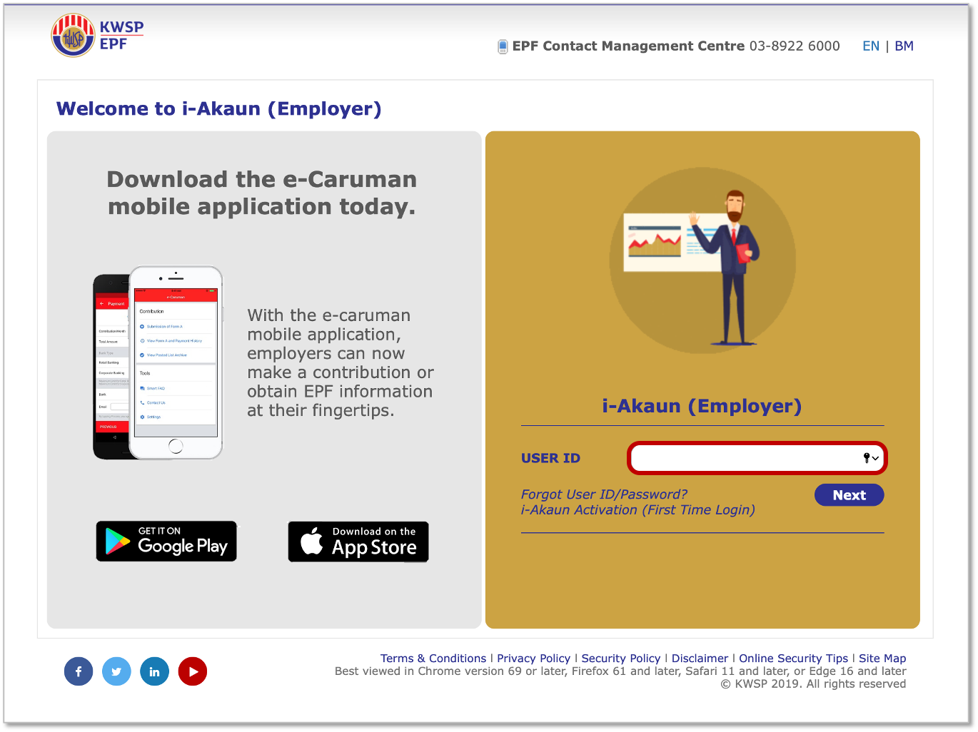 1. Visit the i-Akaun (Employer) and enter your User ID, then click Next.