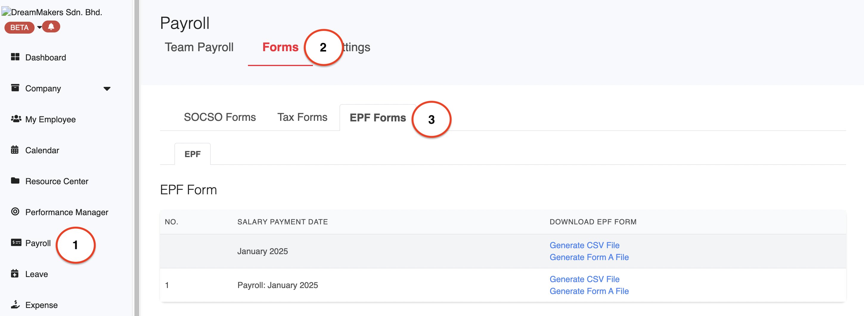 1. Go to Payroll > Forms > EPF Forms.