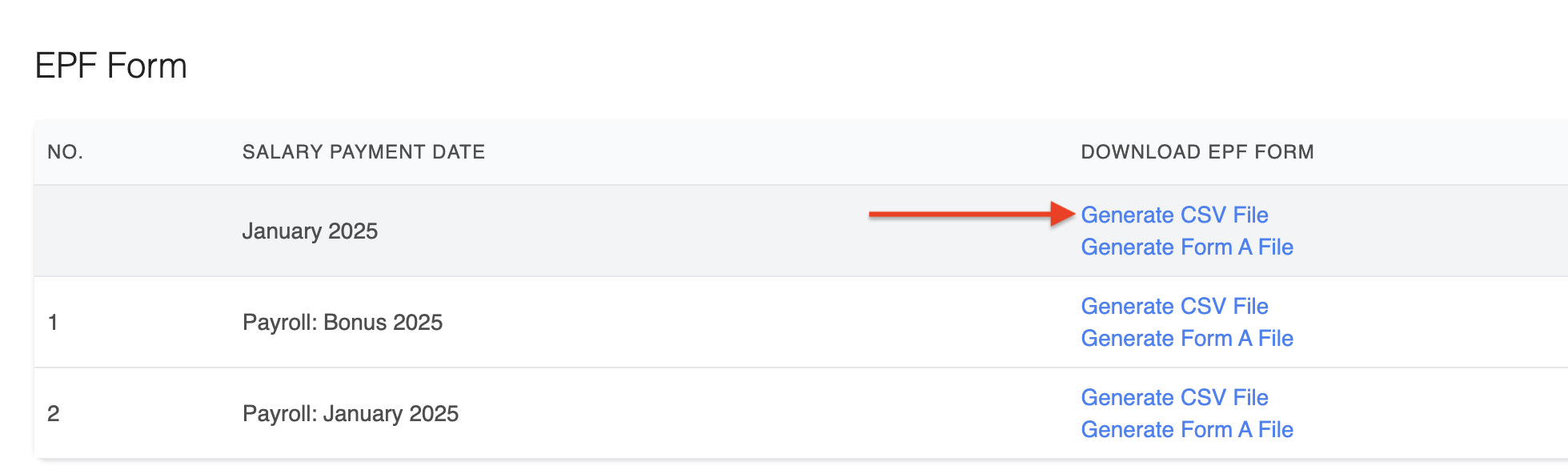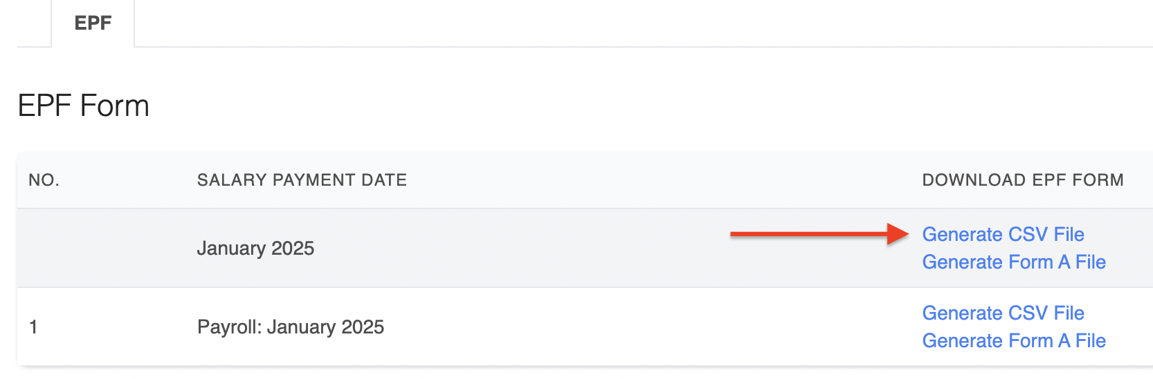 3. If you process multiple payrolls within the same month, use the Generate CSV File button under the Month section to produce a combined EPF file.