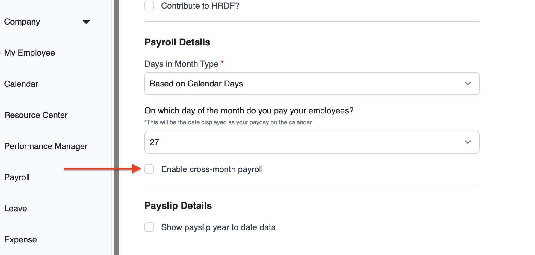 2. In the Payroll Details section, tick Enable cross-month payroll.