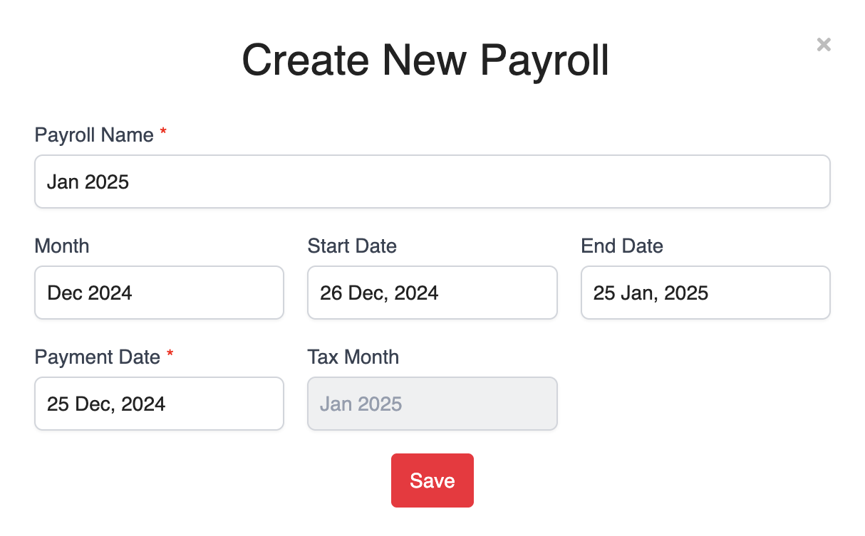 Choose the correct start and end dates, and make sure the tax month aligns with your payroll month. For example, to generate the January 2025 payroll, set the Month to December 2024.