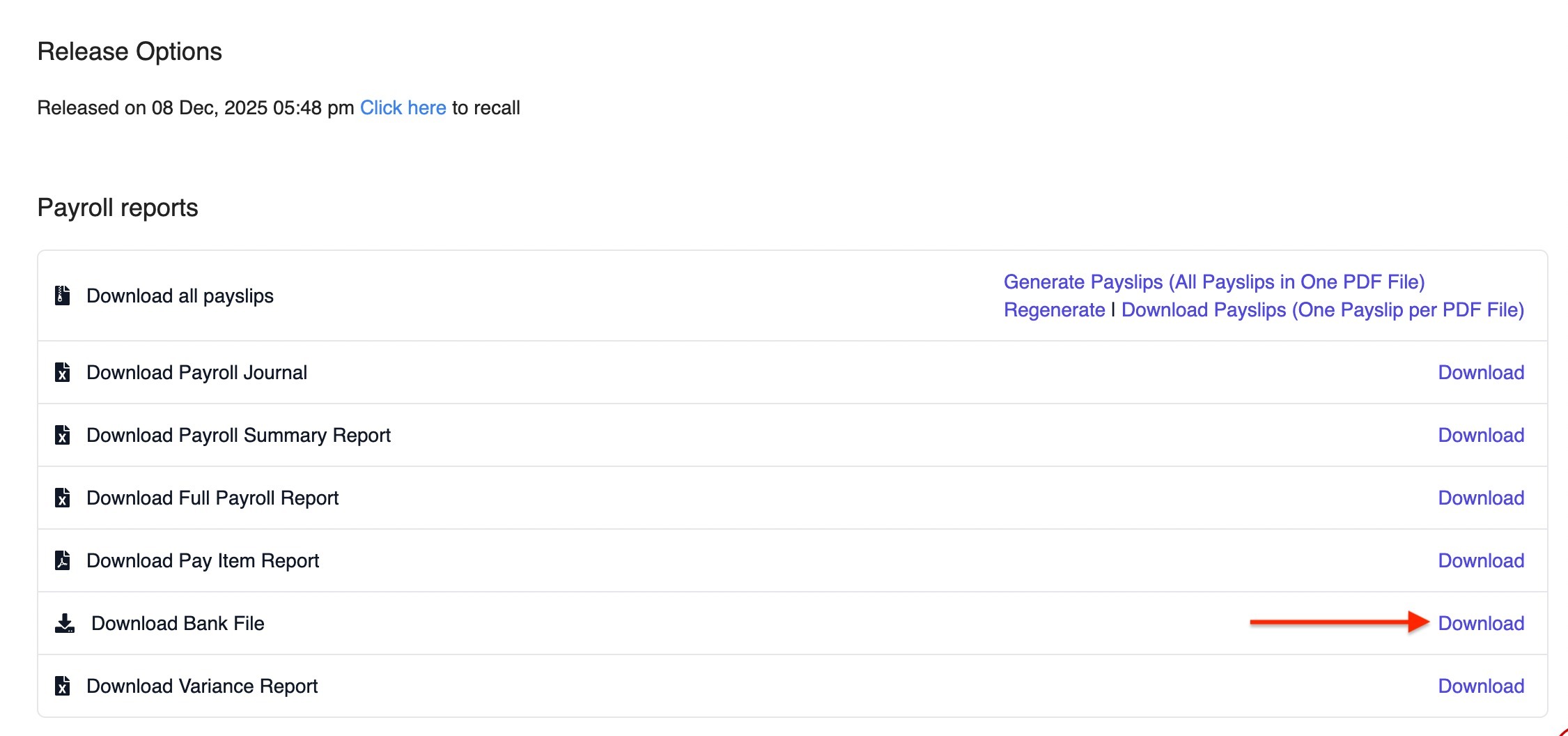 1. Go to Payroll > Team Payroll > select any payroll, whether draft or complete > select Download Bank file.