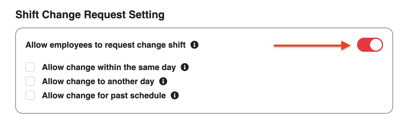2. Scroll down to the Shift Change Request Setting section, then turn on the Allow employees to request change shift toggle. Once enabled, employees will be able to submit shift change requests based on the options you select below.