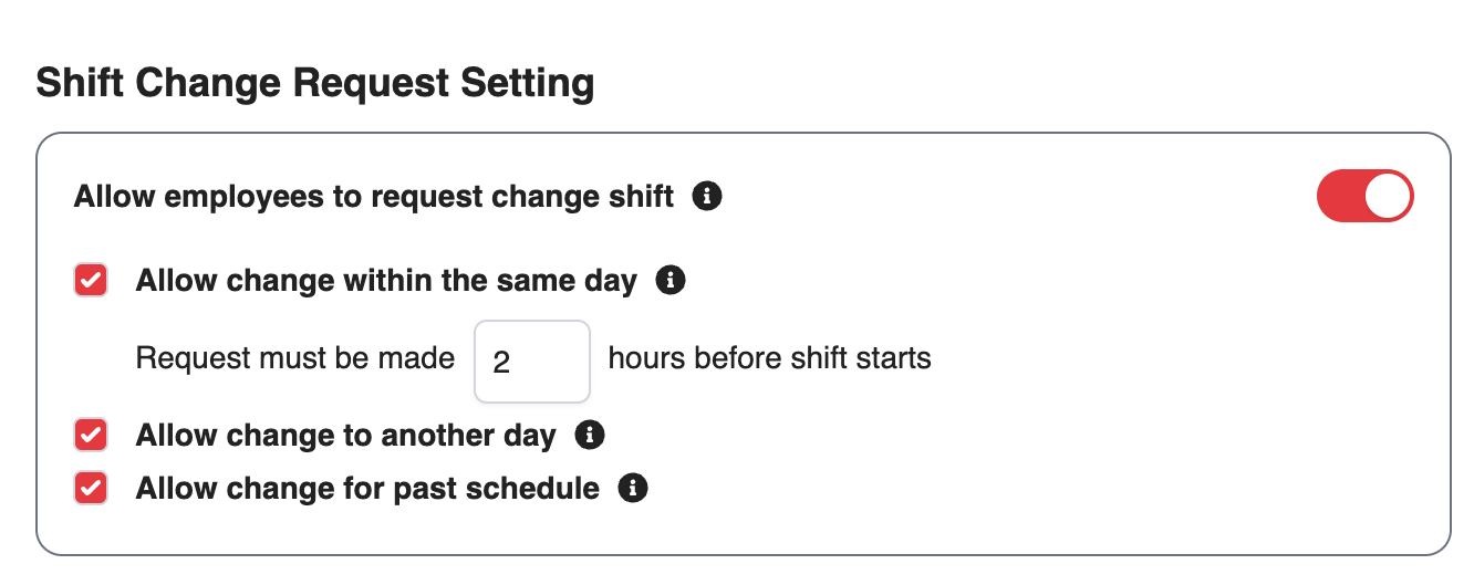 Allow change for past schedule: Enable this option to allow employees to request changes to shifts on past dates. ⚠️ This setting will override the same-day shift change restriction, allowing requests for previous schedules.