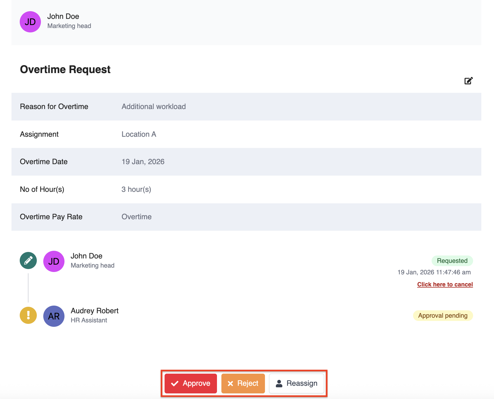 3. Select Approve, Reject, or Reassign the request as appropriate based on your review.