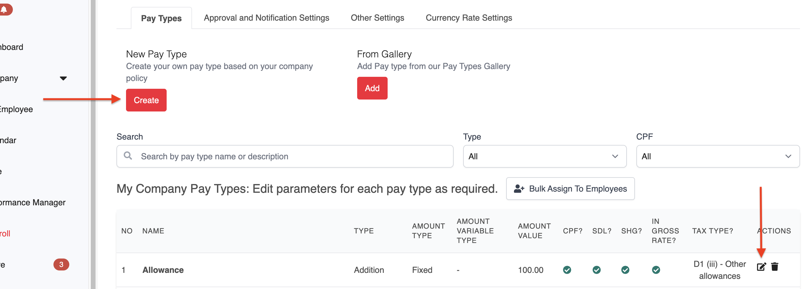 2. Click Create to set up a new pay item, or click Edit next to an existing pay item to update it.