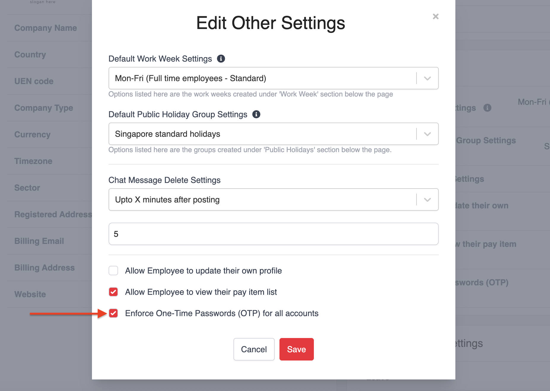 To enhance the security of your company account, administrators can enforce the use of One-Time Password (OTP) verification for all users. When this setting is enabled, every user will be required to enter an OTP during login as an additional authentication step. This helps protect sensitive company and employee data by ensuring that only verified users can access the system.