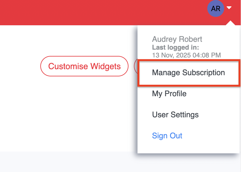1. คลิกที่ไอคอนรูปวงกลมมุมขวาบนของหน้าจอ จากนั้นคลิก Manage Subscription