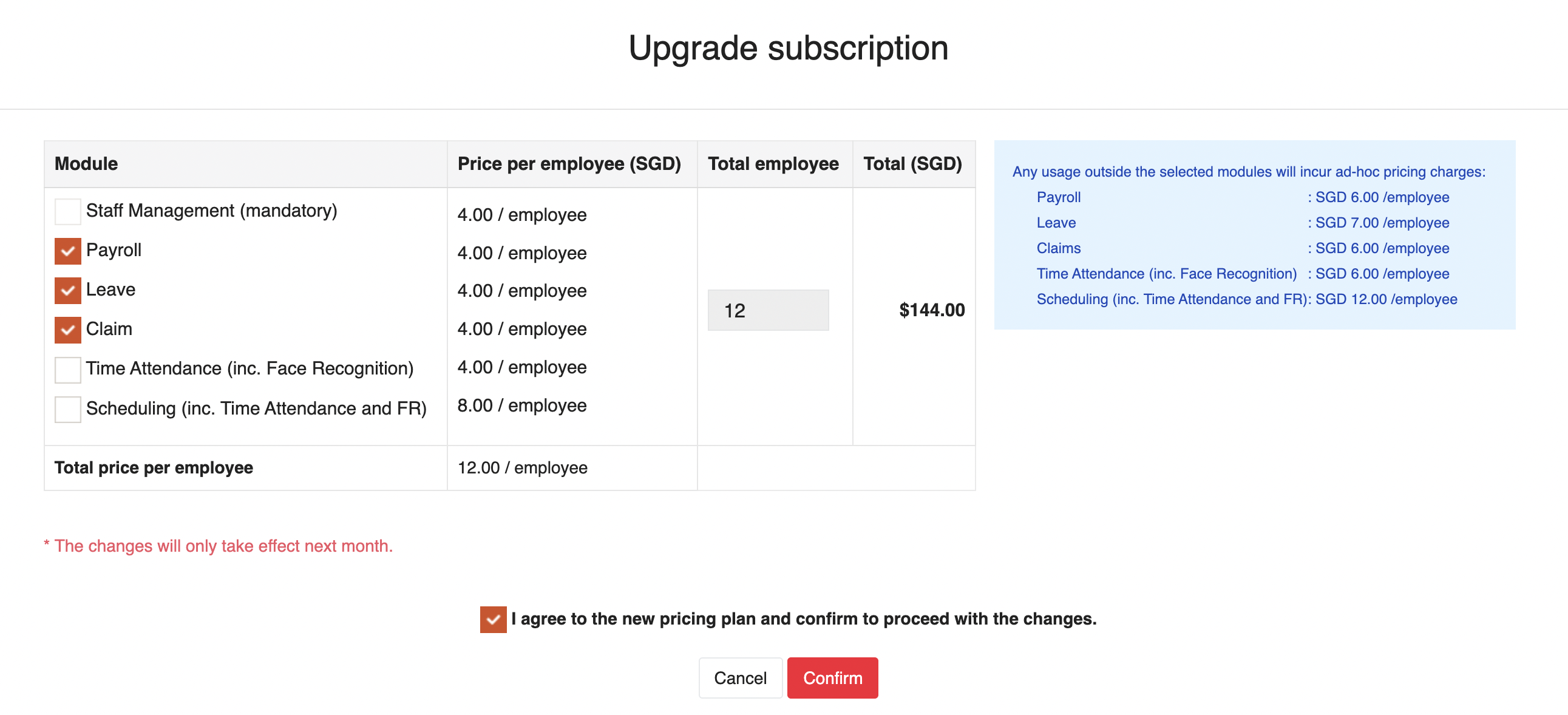 3. เลือก/ยกเลิกการเลือกโมดูลตามต้องการ จากนั้นกดยืนยันการเปลี่ยนแปลงด้วยการเลือก 'I agree to the new pricing plan and confirm to proceed with the changes.'