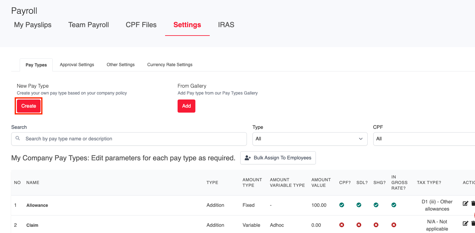 2. กดปุ่ม "สร้าง" ภายใต้หัวข้อ "ประเภทการจ่ายใหม่" (New Pay Type) เพื่อสร้างประเภทการจ่ายที่เปลี่ยนแปลงได้ หรือเลือกประเภทการจ่ายที่มีอยู่แล้วเพื่อทำการแก้ไข