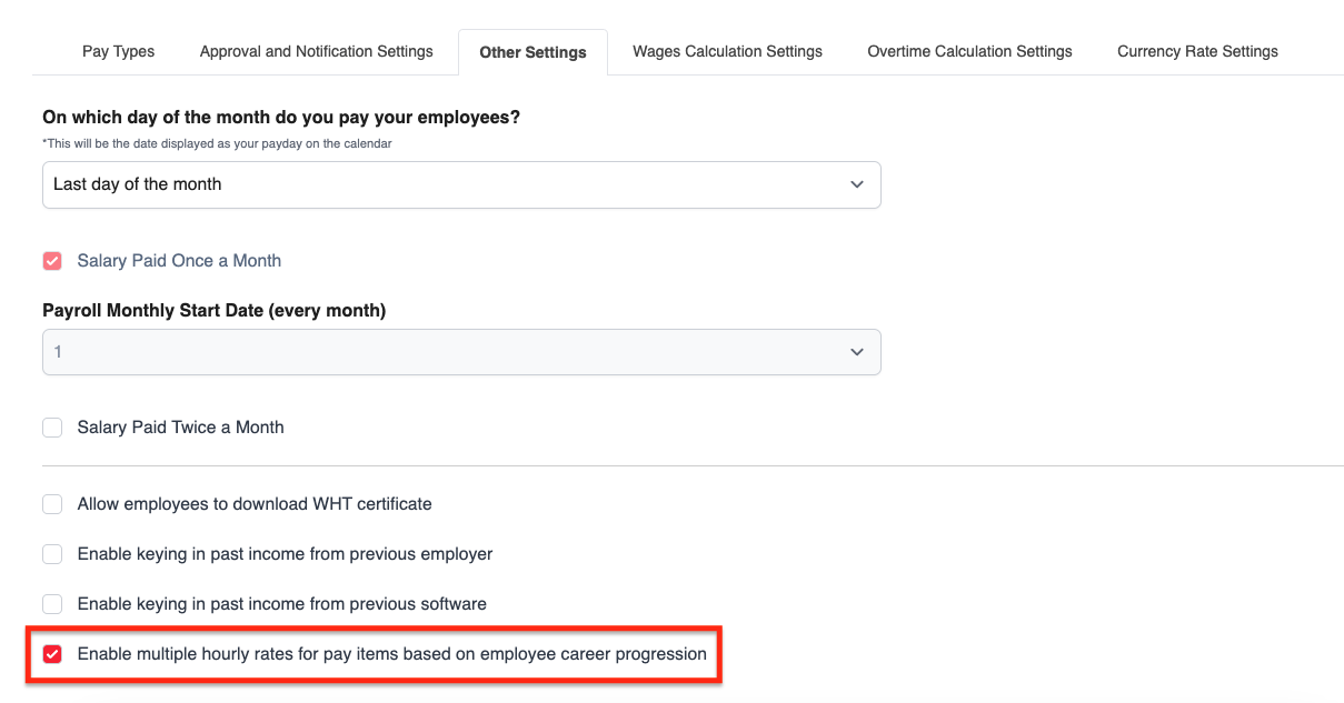2. ติ๊ก "อัตราการคูณจำนวนต่อชั่วโมง สำหรับรายการจ่ายที่อ้างอิงตามความก้าวหน้าทางอาชีพของพนักงาน" (Enable multiple hourly rates for pay items based on employee career progression)