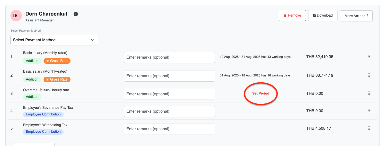 3. ขณะกำลังทำเงินเดือน คุณสามารถเพิ่ม "รายการจ่ายคิดตามอัตรารายชั่วโมง" จากนั้น กดเลือก "ตั้งค่าช่วงการจ่าย" (Set Period) ซึ่งอยู่ถัดไป